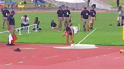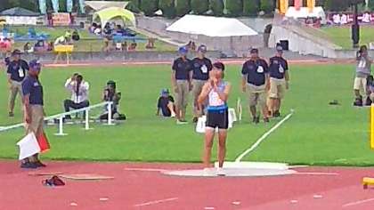 陸上部砲丸投げ決勝で、5投目15m66を投げて現在のところ1位です。
