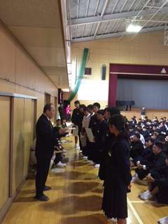 認証式の後、総合文化祭に出品した美術の賞状の紹介を行いました。最後に、陸上部で先日の大阪市民カーニバルで2位入賞した低学年リレーと、大阪府の総体・カーニバルで大会新記録で優勝した2年女子砲丸投げの賞状を渡しました。砲丸投げは間近に迫ったジュニアオリンピックでの活躍が楽しみです。
