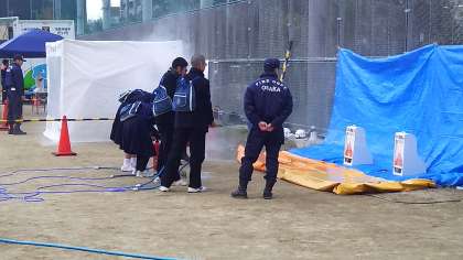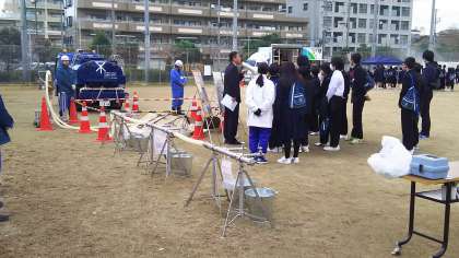 沢ノ町グランドの地下にある貯水槽の説明を受けている様子、水消火器を使った消火訓練の様子、煙ハウス体験の様子です。