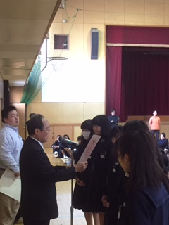 1月10日(火)3学期の始業式を行いました。新年の挨拶の後、部活動の表彰を行いまいした。吹奏楽部が、大阪府アンサンブルコンテストの金管七重奏で銀賞を受賞し、ソフトテニス部の男子が大阪市中学生ソフト連盟杯の団体の部で3位になりました。最後に陸上部2年生の日夏涼香さんが、「JAAF U16全国研修合宿」に参加した報告をしました。3学期は今年度のまとめをする時期です。各学年とも新たなステージへのステップアップを目指して頑張りましょう。