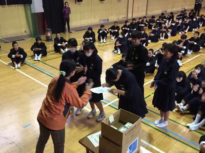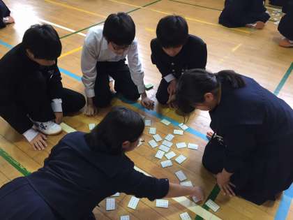 上の句が読まれてすぐに「はいっ!!」と札を取るなど、昨年より全体のレベルが上がり非常に盛り上がりました。またマナーも良く、学級代表が中心になって大会を運営し、やりきることが出来ました。集計の最中も盛り上がった雰囲気を維持するために大会後の感想を聞くインタビューなどの工夫があり、最後まで大いに楽しむことが出来ました。