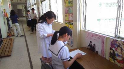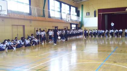 5月22日(月)月曜日の1時間目は特別活動の時間です。1年生(写真上)は体育館で、一泊移住の集団行動の練習をしていました。2年生は(写真中)職場体験で事業所に提出する書類を居室で作成し、職員室前から事業所に電話をかけて、事前訪問のために電話でアポイントメントを取っていました。3年生は(写真下)は修学旅行のスタンツの準備をしていました。しっかり準備してそれぞれの行事を成功させましょう。