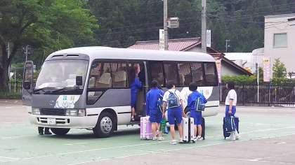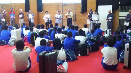 1時間遅れで入村式を行いました。生徒代表と民家の代表の方の挨拶してから、今日一日お世話になる民家に車で向かいました。