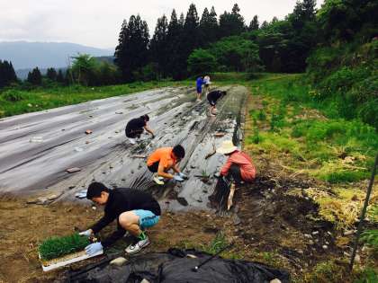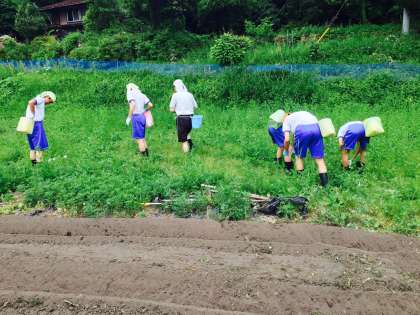 農作業の体験をしています。この後ここで魚を釣って食べるそうです。みんな楽しんでいます。