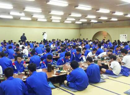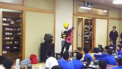 お昼ご飯を食べてラフティングの説明を受けました。みんな元気一杯です。