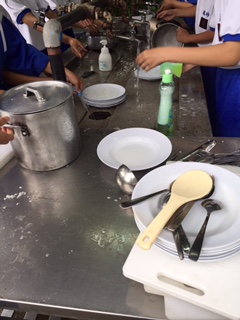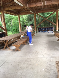 ようやく雨が上がりました。野外炊事の後片付けをピカピカになるまで頑張りました。