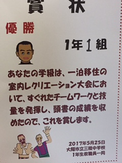 室内レクレーション大会の終了です。1組が優勝して表彰されました。