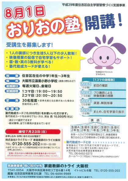 住吉区では今年度より、中学生の学校以外での自主学習習慣の定着と基礎学力の向上を図るため、放課後の学校施設において民間事業者を活用した課外授業を実施することとなりました。遠里小野小学校の多目的室をお借りしまして、週2回、区内の中学生を対象とした塾を開講します。本日、住吉区役所からの案内のチラシを配布しています。