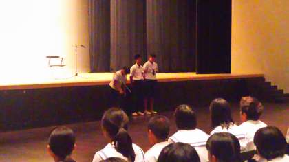講演会終了後に、近畿大会・全国大会に出場する陸上競技部の生徒が、全員の前で大会での活躍を誓い、生徒全員から大きな拍手の応援をしてもらいました。