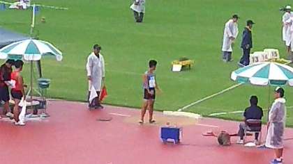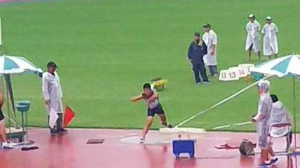 8月21日(月)第44回全日本中学校陸上競技選手権大会が、熊本県立えがお健康スタジアムで開催中です。競技開始前から雨が降り始める生憎の空模様の中、3年生男子が砲丸投げに出場しました。1投目12m96、2投目11m34、3投目12m74で、よく健闘しましたが残念ながら予選通過なりませんでした。