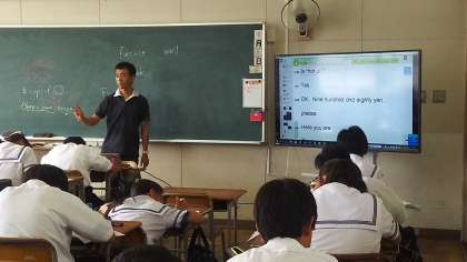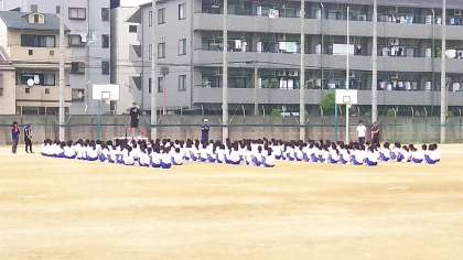 9月6日(水)上の写真は、1年生の国語の授業で、電子黒板を活用した授業で書写に取り組んでいました。中の写真は、1年生の英語の授業でデジタル教科書を使ってディクテーション(聞き取った英文を書き取る練習)に取り組んでいました。下の写真は、運動会の1年学年練習の様子です。それぞれみんな真剣に取り組んでいました。