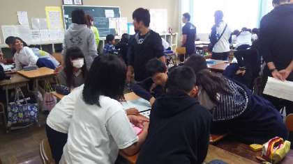 南住吉小学校6年4組は体育館で体育の授業(写真上)、大空小学校6年生は社会の授業(写真下)を体験しました。それぞれ工夫を凝らした授業に、小学生は楽しそうに取り組んでいました。