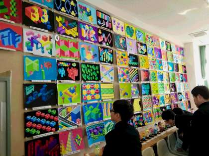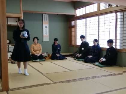 午後の発表では、茶道部がお点前を披露し(写真上)、2年生全員で作成した木彫の校歌(写真中)、文化部や各教科の作品や自由研究の作品(写真下)を生徒たちと一緒に大勢の保護の皆さんが熱心に見学されました。