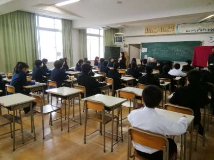 4月17日(火)今日は全国学力・学習状況調査が実施されました。3年生は、一日中真剣に取り組んでいました。お疲れさまでした。1・2年生は通常授業で、写真上はLL教室での2年生のC−ネットによる英語の授業と、写真下は1年生の音楽の授業の様子です。