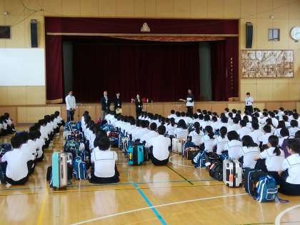 5月20日(日)今朝は曇っていて少し肌寒い朝になりました。体育館で出発式を行い7時40分に学校を出発しました。休日の早朝にもかかわらず見送りに来ていただいた保護者の皆さま、部活動の生徒の皆さんありがとうございました。