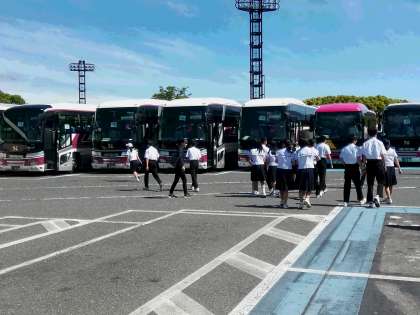 山陽道の龍野西サービスエリアでトイレ休憩です。天気は晴れて気持ちの良い天気です。バス中ではバスレクで盛り上がっています。