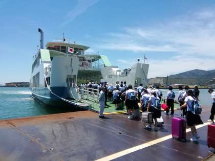 竹原港を出発して大崎上島に向かいます。船上で生徒たちはおおはしゃぎです。
