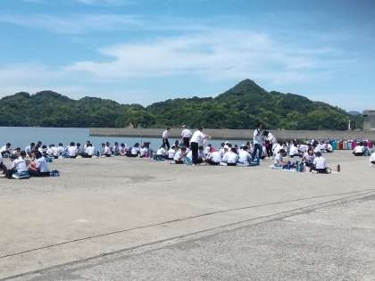 今朝の集合時間が早かったのでみんなお腹ペコペコです。心地良い潮風が吹いています。この後2時から入島式です。