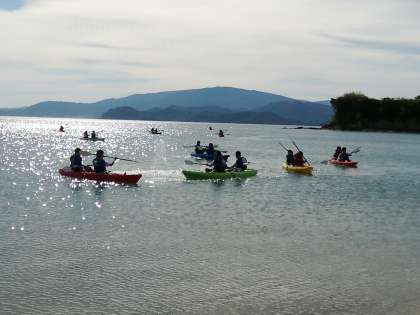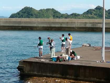 民家の方の手解きで波止でメバルを釣っていました。釣り上げたメバルを針から外すのに悪戦苦闘していました。別の班は穏やかな海でシーカヤックを楽しんでいました。