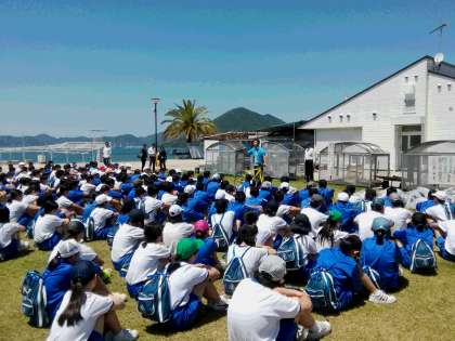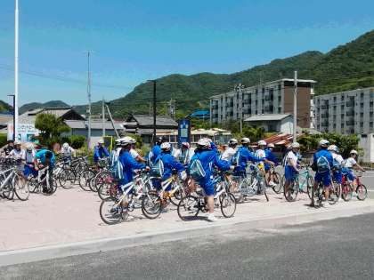 昼食を食べて、バスで広島県の生口島のサンセットビーチに到着しました。係員の方からサイクリングの説明していただいて、いよいよサイクリングに出発します。