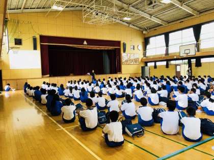6月8日(金)1年生は体育館で出発式を行い、これからバスで堺市立日高少年自然の家に向かいます。バスが発車した頃から小雨が降り始めましたが、生徒たちはバスの中でおおはしゃぎです。
