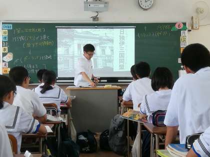 6月12日(火)3限目に3年生の社会の授業で、教育実習生の研究授業を行いました。大勢の先生方が参観に来られたので、実習生はかなり緊張して授業をしていました。でもさすがは3年生、積極的に手を挙げるなど助け船を出していました。明日は、時間割変更で木曜日の時間割、3年生は文楽鑑賞に出かけます。生徒の皆さんは、忘れ物をしないように注意してください。
