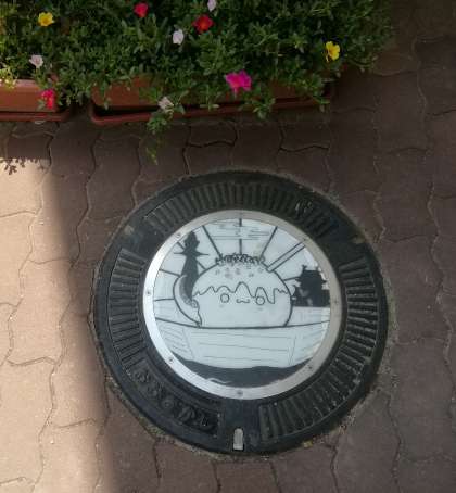 日本下水道協会が下水道展'14大阪の開催を記念して小中学生対象の「デザインマンホール作品」コンクールを実施しました。三稜中学校の美術部がコンクールに応募し、その当時1年生の女子生徒の作品が中学生の部で特選に選ばれて表彰されました。そのデザインがマンホールの蓋に製品化されて大阪市内に設置されたものです。通天閣、大阪城とたこ焼きが描かれていて、大阪らしさがあふれるマンホールの蓋です。