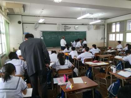 7月5日(木)三稜中学校は、今年度から2年間大阪市教育委員会の学力向上モデル校として数学科の授業研究を中心として学力向上に積極的取り組んでいます。今日は、教育委員会の学力向上グループの指導主事が1年生の数学の授業参観に来られました。生徒たちは元気で活発で授業を受けていましたが、少し緊張しているようでした。