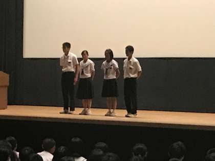 8月1日(水)、区民ホールで登校日の講話の後、全国・近畿大会に出場する陸上競技部4人が応援のお礼と決意表明をしました。