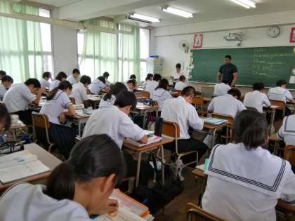 9月18日(火)文化祭がいよいよ1週間後に迫ってきました。今週は、文化祭強化週間のために45分授業となっています。生徒たちは文化祭で浮かれることなく授業に取り組んでいます。写真上:1年の女子体育の授業、写真下:3年生の英語の授業の様子です。