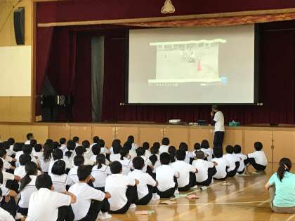 パソコンで動画・写真等を使い、種目のルールの説明や入退場での動きの説明がありました。全体で大きな声で歌ったり、掛け声をかけ合ったりと楽しい中での競技です。お楽しみにして下さい。