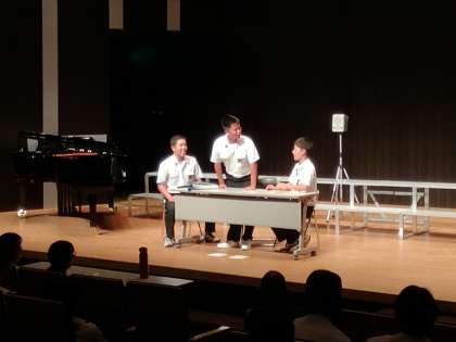 3年生も学年全クラスの発表が終わった後、審査の結果が発表されました。26日(水)の自由曲の結果と合わせて学年の最優秀賞、優秀賞を決定します。審査結果を待つ間のコント会場は大いに盛り上がりました。