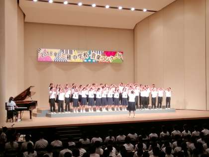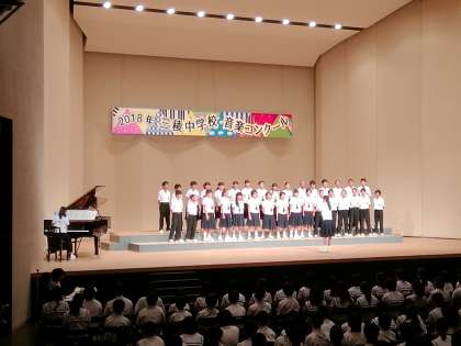 9月26日(木)住吉区民センター大ホールで文化祭を開催しました。開会の挨拶の後、交流を行っている大阪府立大阪南視覚支援学校の生徒会長から挨拶がありました。第1部は1年生の自由曲の発表です。各クラスの自由曲は発表順に、3組「アイネクライネ」(写真上)、2組「やってみよう」(写真中)、1組「言葉にできない」(写真下)