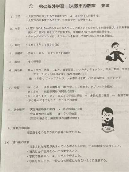 今回の校外学習は、自分達であらかじめ決められた大阪市内の施設から数か所を選び(海遊館は全員)、見学したのちに予定通りの時刻に学校に帰るというものです。各クラス、男女6〜8人5班で構成されています。
