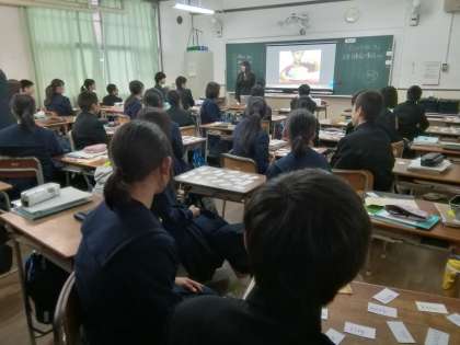 12月6日(木)6限目、他校から英語科の新任教員の先生方10名が参加されて、1年4組で英語科の研究授業を行いました。生徒たちは、ペアやグループに分かれて英語かるたを使ったり、タブレットの映像見ながらナレーションを考えて発表したりする等、緊張することなく楽しみながら授業に取り組んでいました。