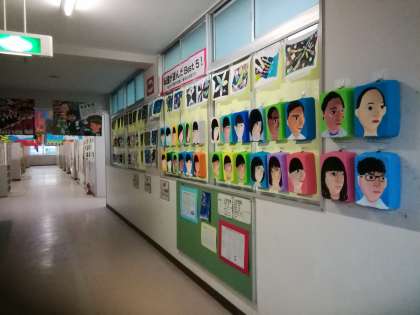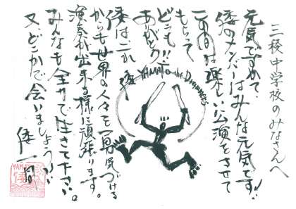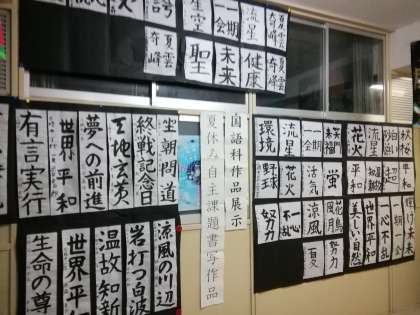 12月18日(火)文化祭の生徒の作品を2年校舎2階廊下(写真上・中)理科室で展示しています。職員室前には総合文化祭に出品した書写の作品も展示しています。また、1階玄関の掲示板には芸術鑑賞で演奏していただいた「倭」の皆さんからのメッセージ(写真下)も掲示していますので是非ともご覧ください。