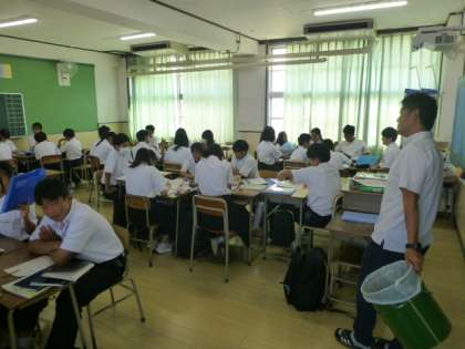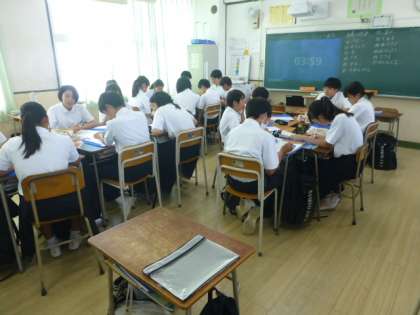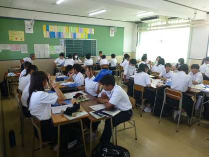 木材、金属、プラスチックのそれぞれの材質の特性を自分でまとめたプリントをもとに班で意見交換をしています。