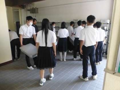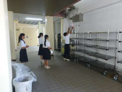 給食を食べ終わったら、当番の生徒と担任の先生が食器や食缶を1階の玄関ホールまで返却しに来ます。
