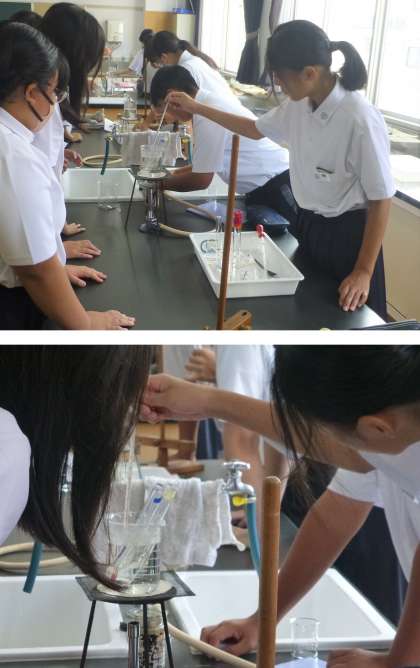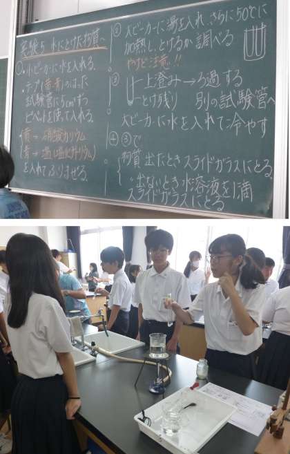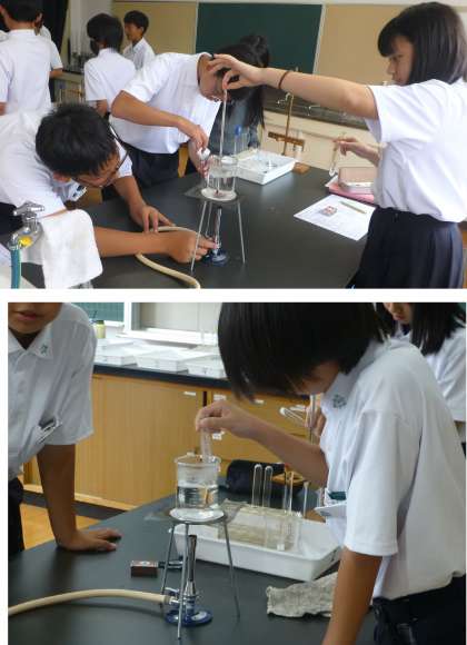 「水溶液に溶けた物質をとりだす実験」をしています。