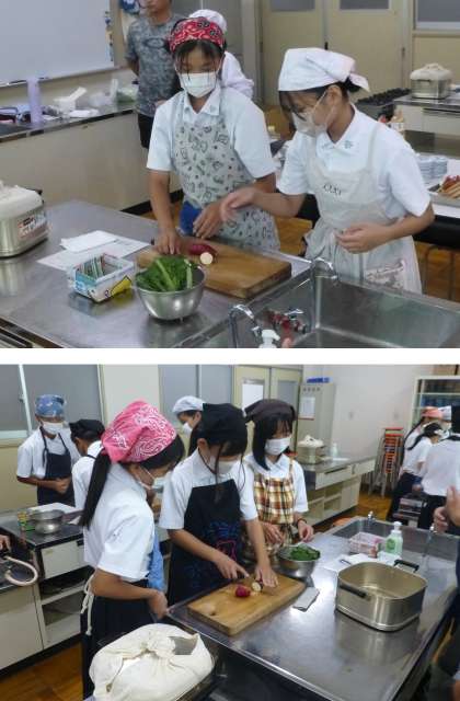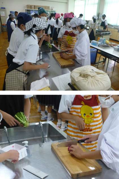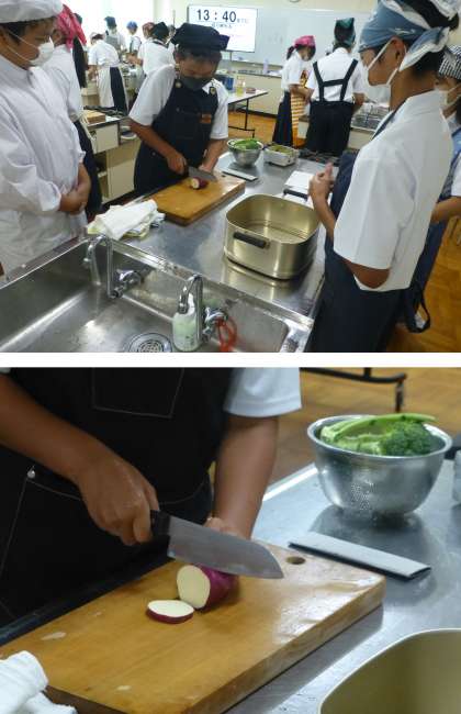 調理実習で「蒸し野菜サラダ」をつくっています。