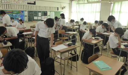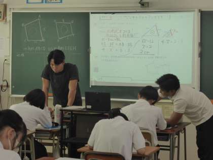 問題がはやく解けた生徒は、まだ解けていない生徒のところに行って、わからないところを教えたり解き方のヒントを出したりしています。