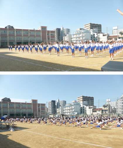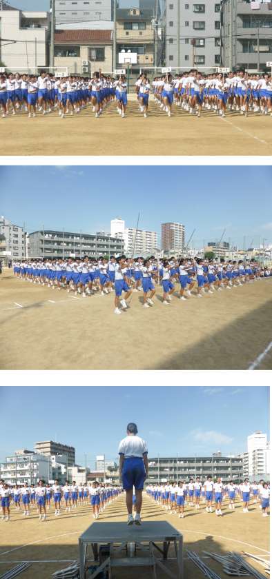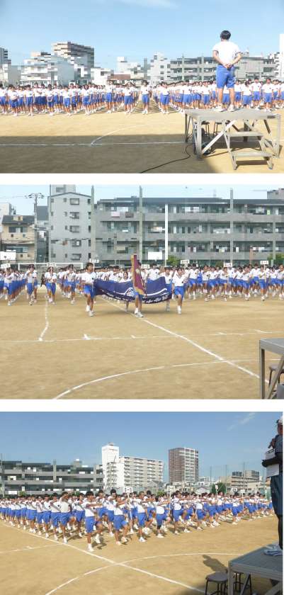 全学年が運動場に集合し、開閉会式の練習や行進、体操、校歌の練習をしました。