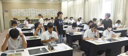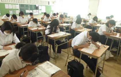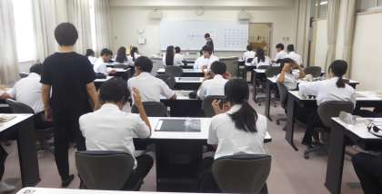 1時間目、1組は、スピーキングのテストをLL教室で行っています。
