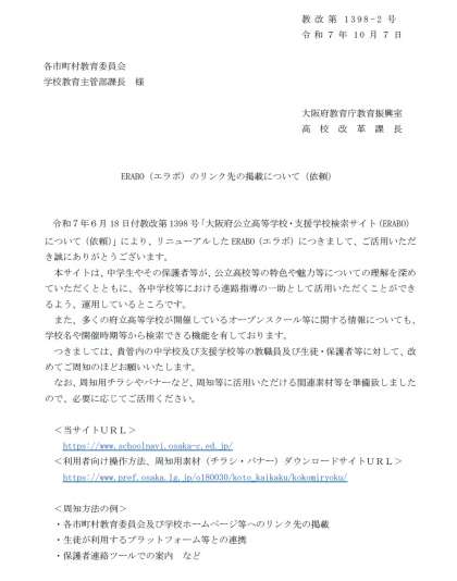 「大阪府公立高等学校・支援学校検索サイト(ERABO)」について、大阪府教育庁より周知依頼がありました。