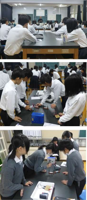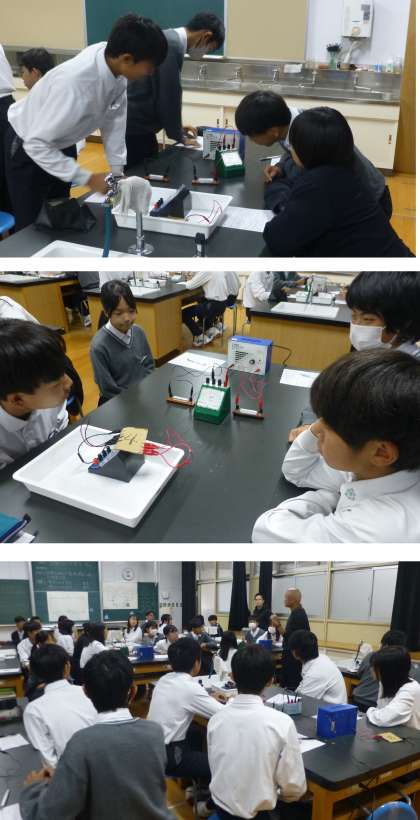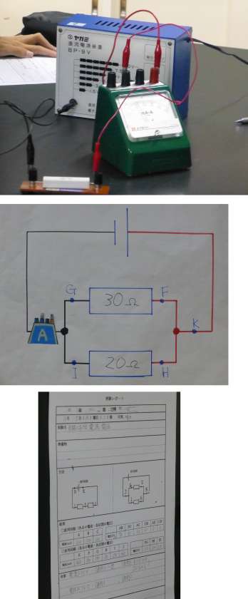 回路図から、実物の抵抗や電源をつなぎ合わせて、電流計、電圧計で測定しています。