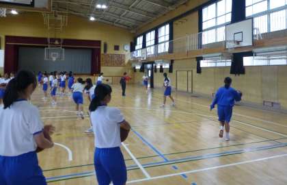女子はバスケットボール、男子は持久走のあとサッカーをしています。