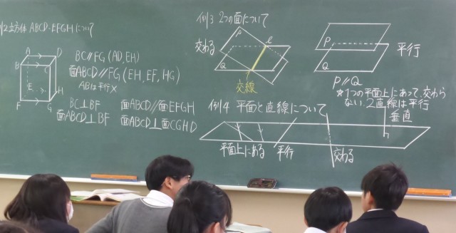 立方体のそれぞれの面の位置関係や空間における2つ図形の位置関係について学習しています。