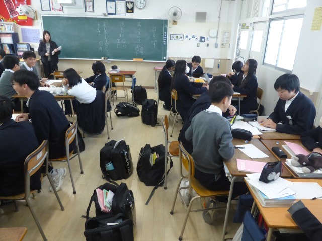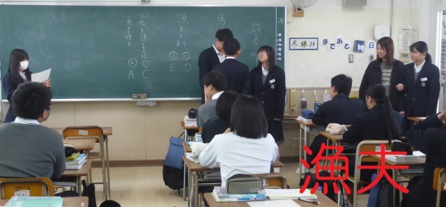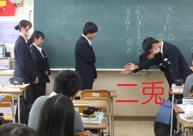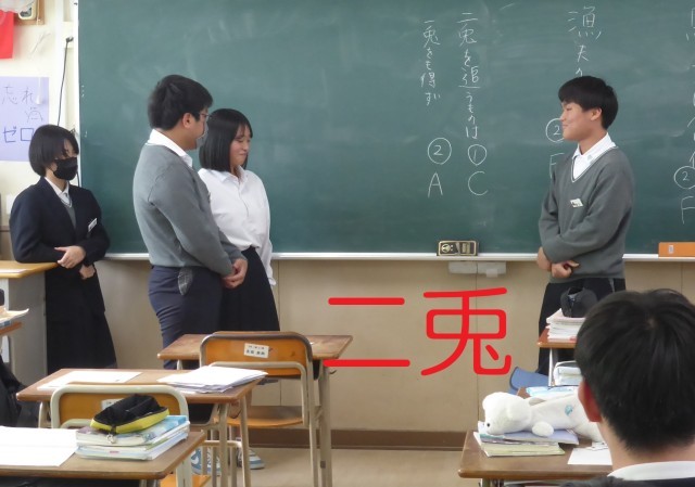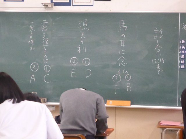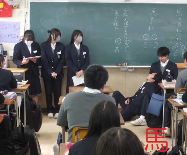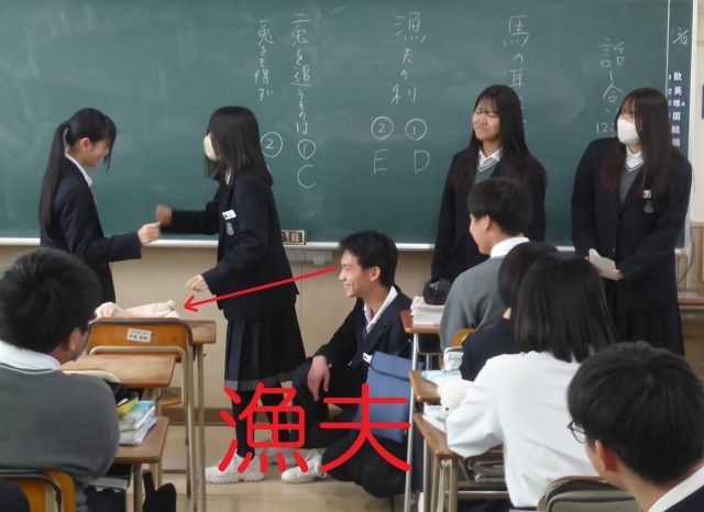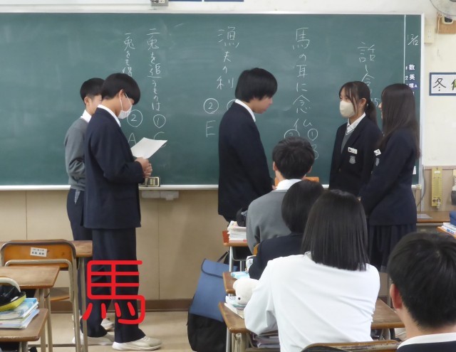 「馬の耳に念仏」、「漁夫の利」、「二兎を追うものは一兎をも得ず」の3つのことわざから一つ選んで、班ごとに、そのことわざをあらわすような「寸劇」を作って、クラスの前で披露しています。