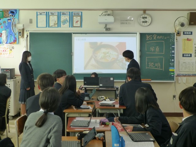 「未来へ引き継ぐ和食(WASHOKU)を考えよう」という教材で学習しています。