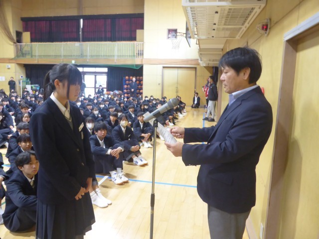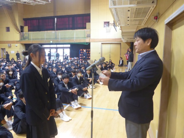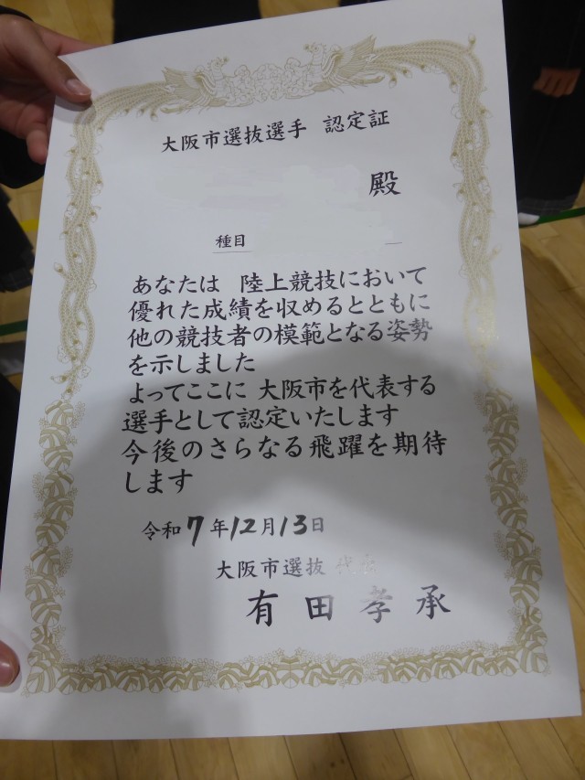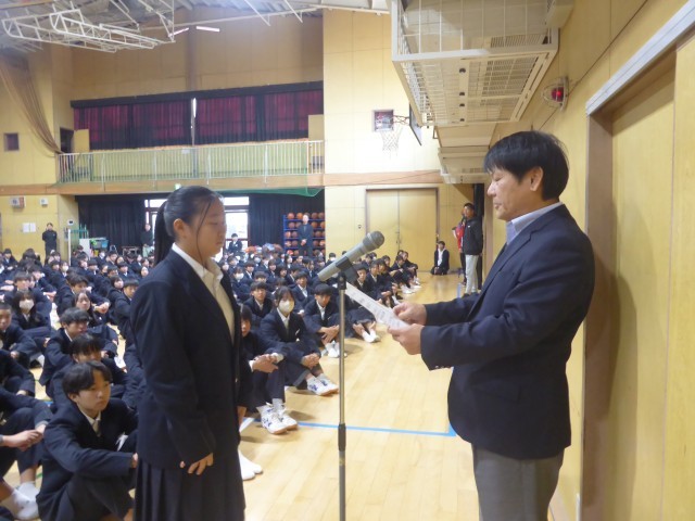 始業式で「税の作文」の表彰状と陸上競技の「大阪市選抜選手認定証」の伝達をしました。